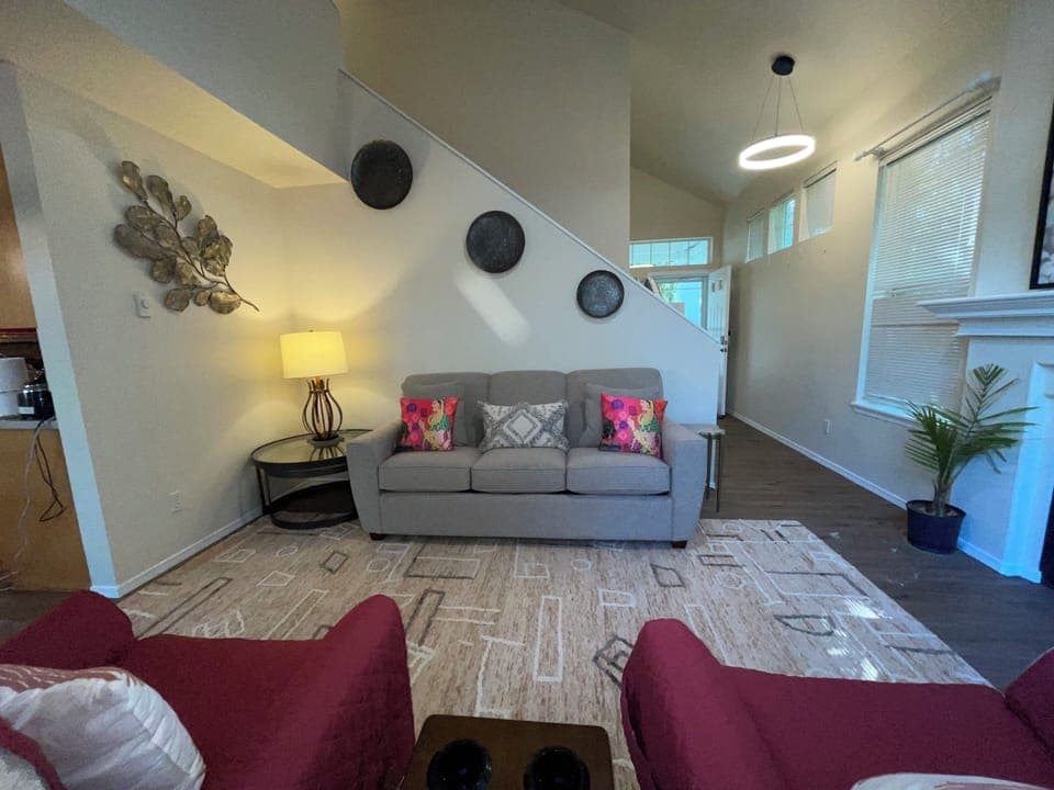 Living Room: Unwind in our airy, sun-drenched living room. With high vaulted ceilings, expansive windows, a ceiling fan, and plenty of comfortable seating—including a plush sofa and cozy reading chairs—it’s the perfect spot to relax after a day of exploring.