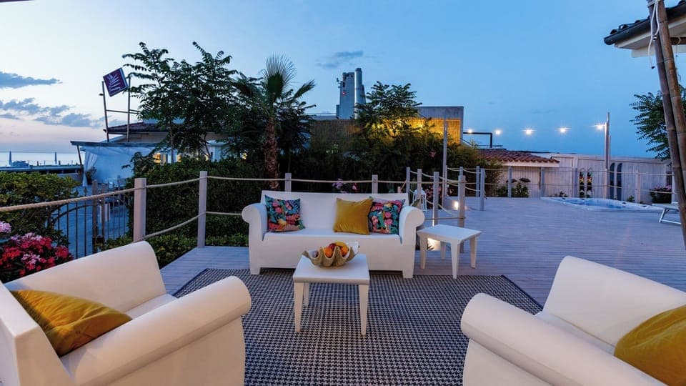 Small cozy house directly on the sea. This beautiful property is the result of a redevelopment project of an old building or a fisherman's house. Modernized, in full respect of the maritime style it already had, a touch of modernity has been added to the exterior, such as the inclusion of the beautiful hot tub placed in the solarium/veranda that surrounds the house on the sea side, shading sails and comfortable outdoor design furniture that will guarantee moments of absolute relaxation. A mix of modernity, comfort and elegance that will allow guests to enjoy a unique holiday along the entire Romagna Riviera. The house, which is spread over a single mezzanine floor, has a beautiful view of the tourist port of Portoverde, allowing you to admire unforgettable sunsets. The proximity to the beach and then to the Lido Restaurant, located in front of the house, offers the possibility to use various services directly on the property for a stay in total comfort.