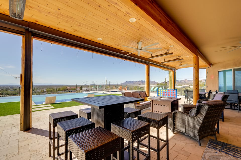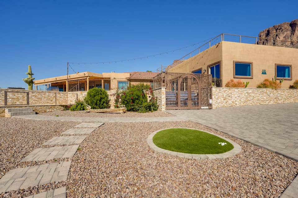 Experience the pinnacle of Sonoran living at this breathtaking vacation rental home in Apache Junction! Watch the Superstition Mountains glow from every room, or slide back the pocket door to merge the chic interior with a massive resort-style patio. At the end of a hike to the Flat Iron, evening views of the sunset and city lights never disappoint. Book today and let your desert dream come true!