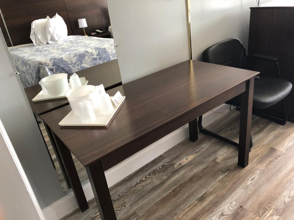 Needs new shower head it sprays every which way. Bedding in room is outdated and itchy. Had burn holes on covers. Chair was stained.