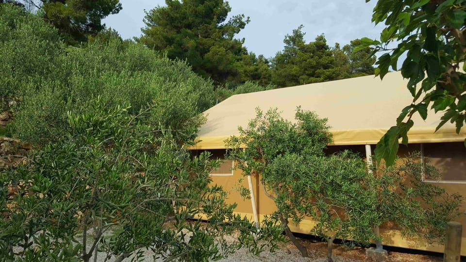 Way out of busy Bol, daily bread service, private sea access, nice nature/greens on the ground, modern bathroom, tent was specious and with several electricity and USB plugs.