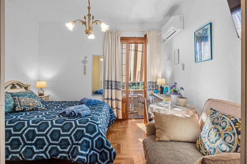 La camera è ben fornita tra frigo bar, condizionatore, tv, tavolino e poltrona. Comodo anche il letto. Inoltre, essa si affaccia ad un balcone con un tavolino per potersi rilassare e con la possibilità di stendere i panni.