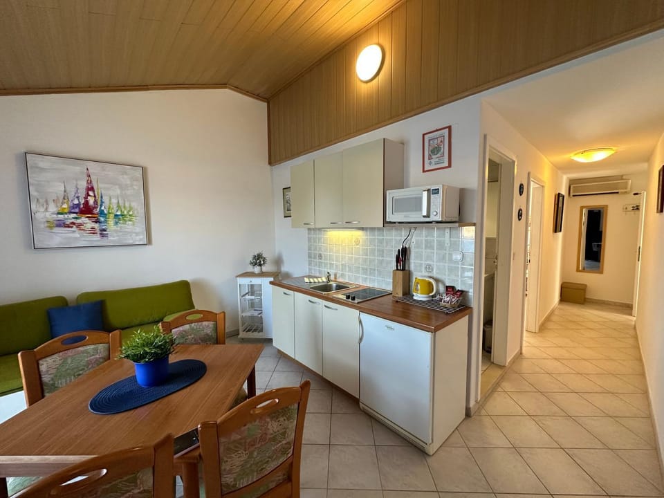 Na žalost, terasu nismo mogli koristiti jer se apartman nalazi u potkrovlju i konstatno je bilo vruće i sparno. Isto tako je bilo i u apartmanu pa smo morali imati stalno uključenu klimu.