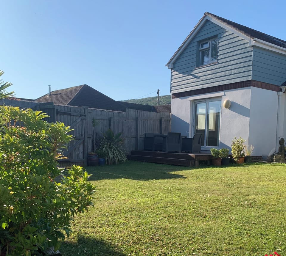 The ground floor comprises of a fully equipped kitchen diner with open-plan living area looking out onto the rear garden and trees beyond. There are sliding patio doors opening out onto decking which looks out onto shared garden with main house. There are 2 steps from the decking down to the garden. Please refer to the photos on the listing. Guests have access to the garden and their own rear gate that opens out onto the lane to the beach. This gate can be locked. Outdoor seating and a table is available for use. Sun umbrella is available on request.