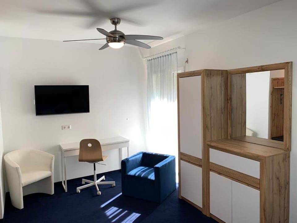 The worst hotel I have stayed ever. We stayed in room 26. We spent there only 1 night (luckily). There were no wifi (internet) in the room at all (not just slow or faltering, but the mobile couldn't even 'see' the network). No signal in TV (it was even unplugged from the socket). No airconditioning. No safe in the room. No telephone to call the reception for help (even no reception). No info book in the room (about wifi, etc.). The soap dispenser in the bathroom was felt down from the wall (they tried to glue it, but it let go), couldn't be used. There were no hood in the very small bathroom, so there was mold on the ceiling above the shower. The room was very small, we had to avoid each other when moving. Beds were very uncomfortable: there was a 50 cm high very soft mattress and overlay (one moved the other was bouncing). The room looked very-very old-fashioned: seemed to be designed in the 1980's and haven't been renovated, just refreshed, yet in the last 40 years. The ceiling was wavy because the putty came off from all the lot of repaintings. The fridge is placed on the open balcony. The parking place was just a weedy small site for max 9 cars 100 meters from the hotel.