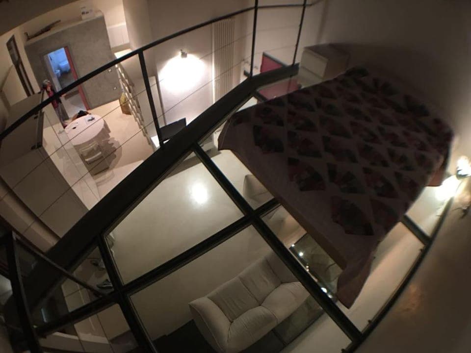 L'appartamento presenta anche delle porzioni in vetro permettono di vedere il pavimento storico e valorizzare la storia dell'appartamento cosí come le travi antiche che donano un fascino unico, abbinate a una soluzione cosí moderna e innovativa come una sezione in vetro e acciaio rialzata per il letto. Le scale possono risultare scomode e poco rassicuranti inizialmente ma non appena ti ambienti e le percorri un paio di volte prendi subito confienza.