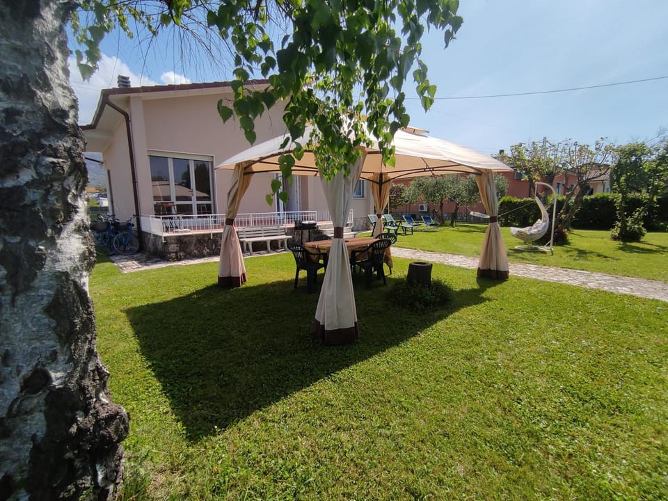 La parte esterna è ampia e ben organizzata con un gazebo che ti permette di fare una grigliata all’ombra e lettini prendisole.
