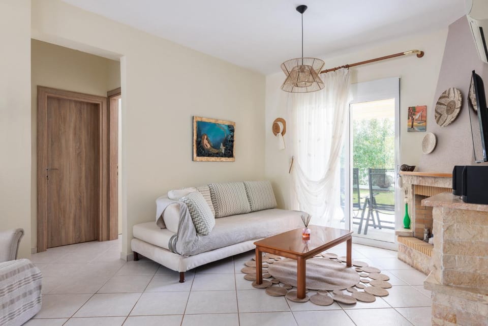 Apartment in a beautiful location 20 meters from the sea. Huge beautifully landscaped garden. Well equipped: large TV, excellent Wi-Fi, large air conditioner and fridge, plenty of space inside and outside the apartment. Pleasant neighborhood and very quiet area. Great for a quiet vacation with family and very safe for kids. Above standard for classic apartments in Greece . Parking directly in front of the front door . Small, relaxed and quiet place with no crowds on the streets and the beach. It looks much better live than in pictures . Nearby larger towns are a few minutes drive away.