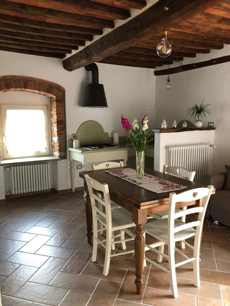 The apartment was charming and tastefully renovated with a great wooden dining table, a beautiful wardrobe and dresser and brass king sized bed. The kitchen has a large stone sink. Beautiful view from the main window which was in the bedroom. The location was lovely too. We had to walk past the church and around to get to our entrance. It was very interesting to be staying inside the middle of a hill town. The host, Debora, was always available on Whatsapp and in person. She greeted us and showed us around. It turned out we were there for the Chestnut Festival. What a fun time! We also enjoyed visits to Volterra, the Populiona Castle, Casale Marittimo, Bolgheri, the COOP and a session at the local thermal baths.