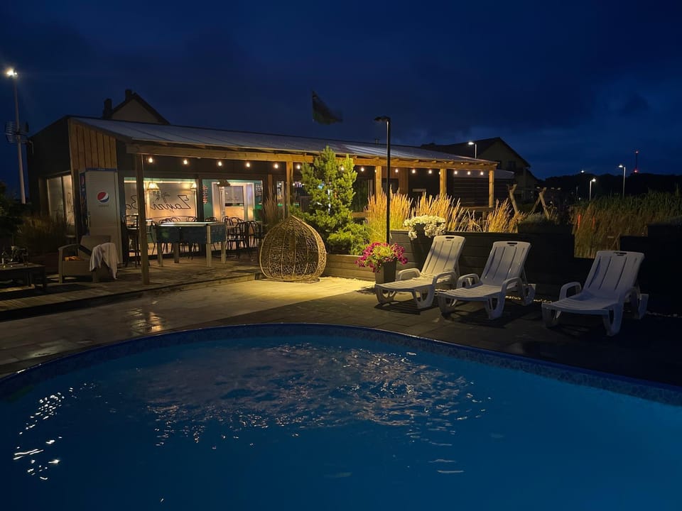 Restauracja bar Zanzibar na terenie obiektu dodatkowe atrakcje muzyka na żywo wspólne ognisko integracja gości w obiekcie oraz bardzo fajne miejsce do rekreacji na terenie obiektu czyli podgrzewany basen oraz boisko do gry w beach soccera oraz najważniejsze bardzo miła obsługa oraz wlaściciele obiektu 😀