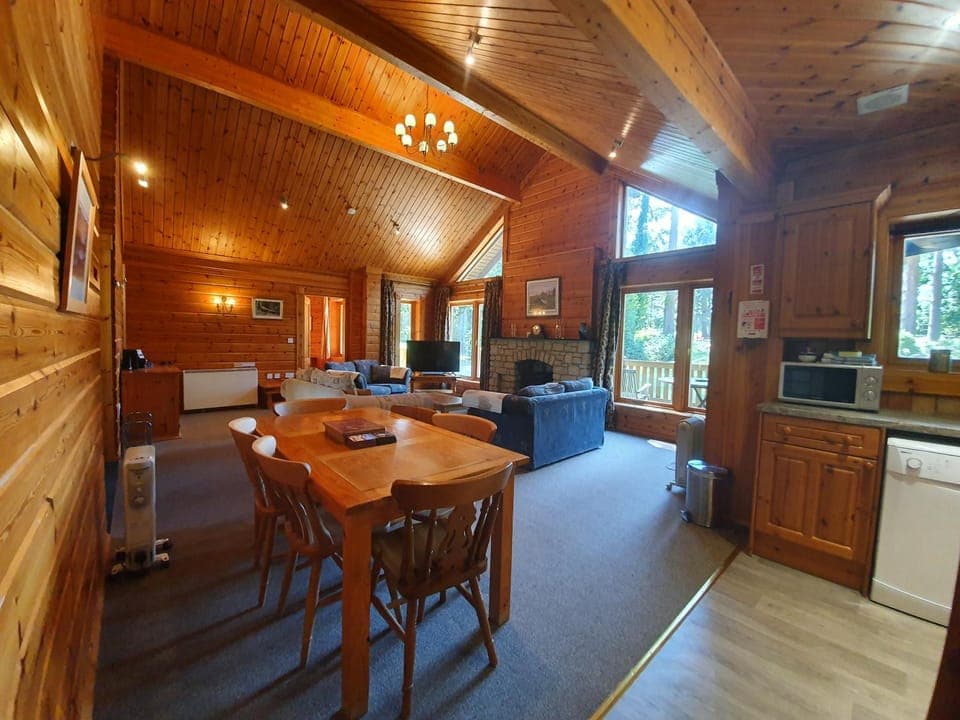 Norwegian style lodge, sauna, open plan sitting room. lovely setting by the woods.