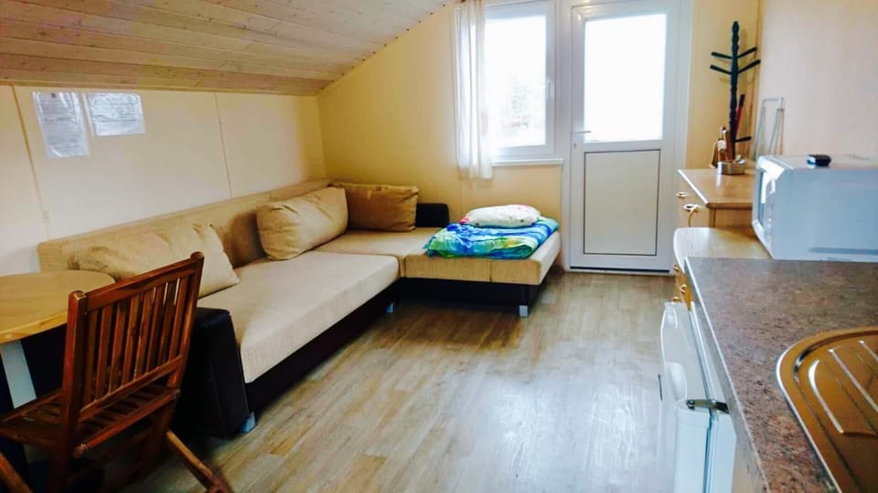 Leider ist direkt hinter der Unterkunft eine Art Trampolin - Wiese. Das war besonders am Abend recht laut. Die Zimmer sind sehr schlicht und eher klein. Die Matratze war unbequem. Es gab eine Küchenzeile mit Wasserkocher und Mikrowelle - allerdings ohne Spüle. Geschirr musste man in dem winzigen Waschbecken im Bad waschen.